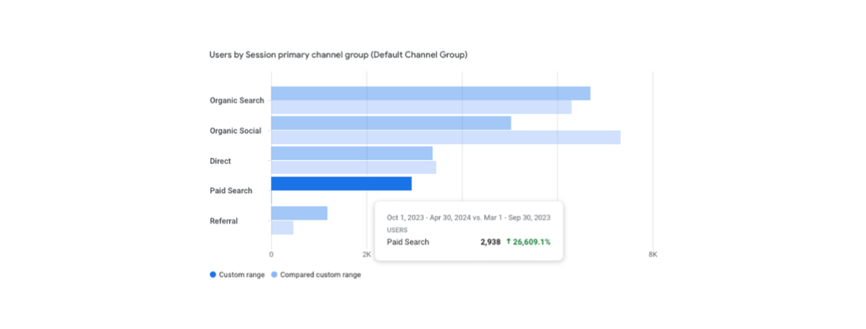 ● Increased website traffic through paid search (26,609% increase in users and 25,616% increase in sessions)